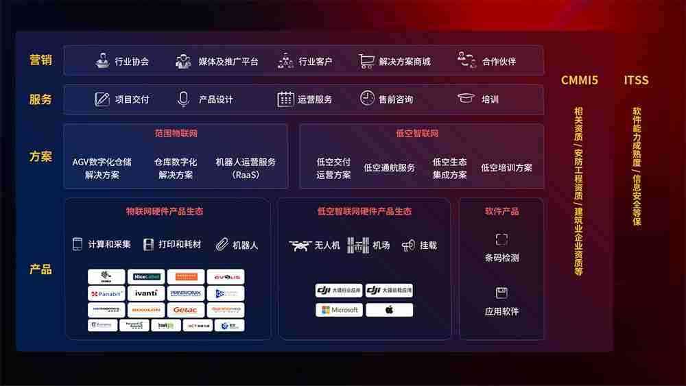 聚合国内外先进的物联网硬件产品品牌,,聚焦数字化仓储、、、机器人运营、、、低空智联网等领域,,,共同打造适合客户业务场景的解决方案并提供交付服务