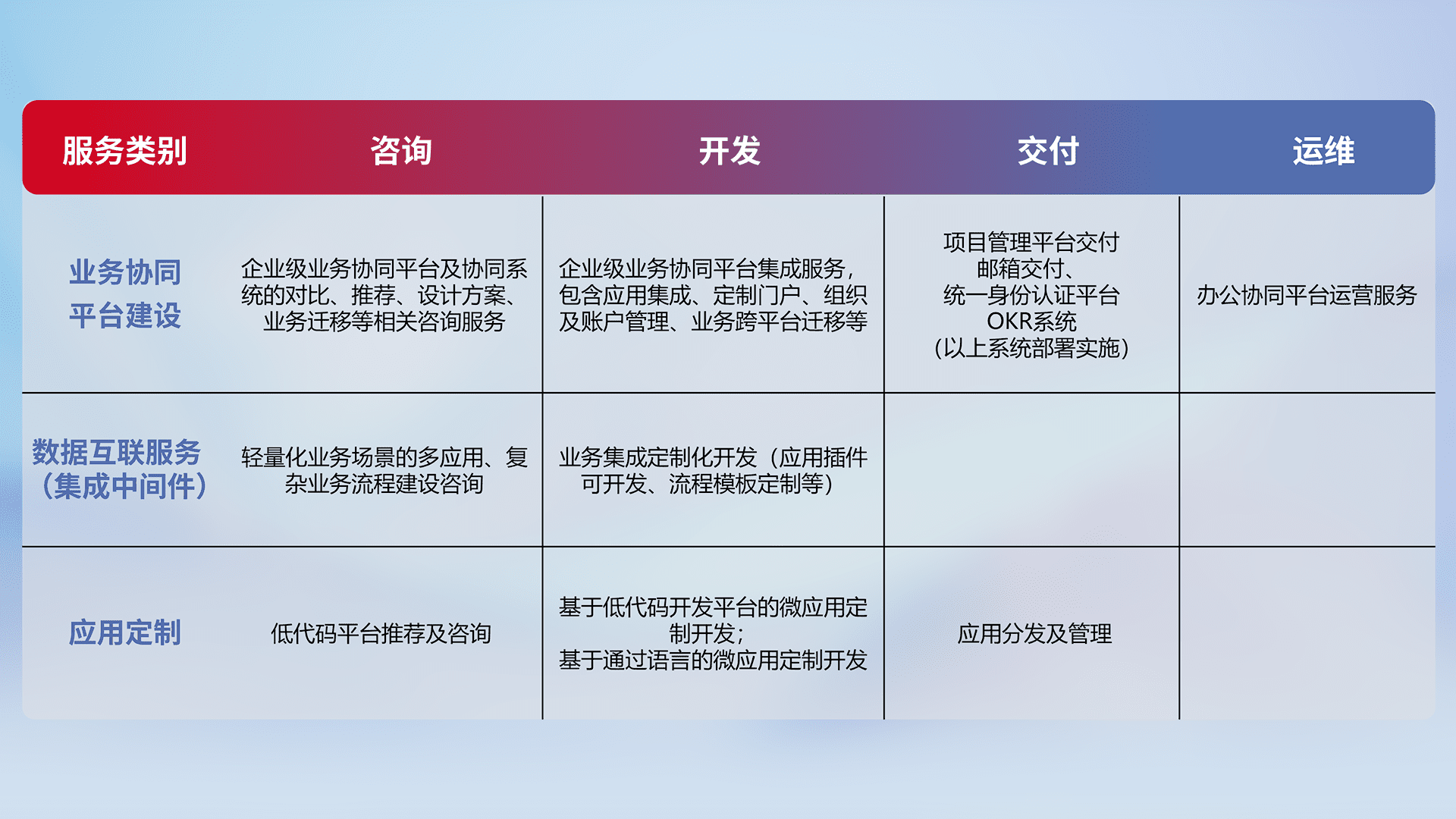 针对钉钉、、、企微、、、、IDaas等平台级产品提供产品的规划、、、、方案、、、、交付、、定制化开发等服务,,,,实现如统一协同办公、、、智能客户服务、、混合会议管理、、、智能数据查询、、等业务场景,,,实现数字化转型。。。。